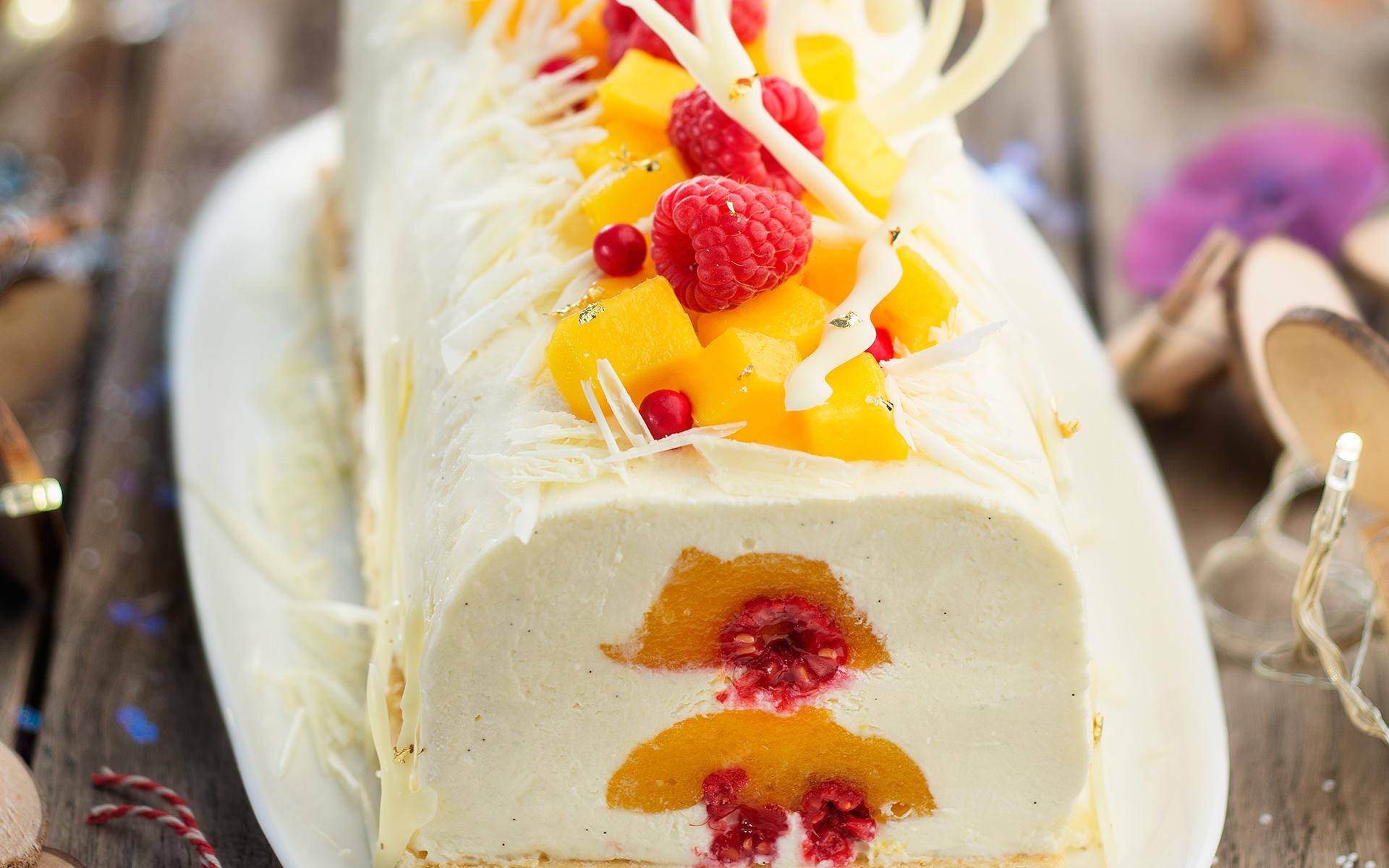 Découper la génoise à la taille du moule et placer sur la crème. Mettre au congélateur 5 h, puis au réfrigérateur 20 min avant de servir. Démouler, couper les extrémités de la bûche, décorer avec la mangue et les framboises restantes, les copeaux de chocolat, les perles de fruits et de sucre.