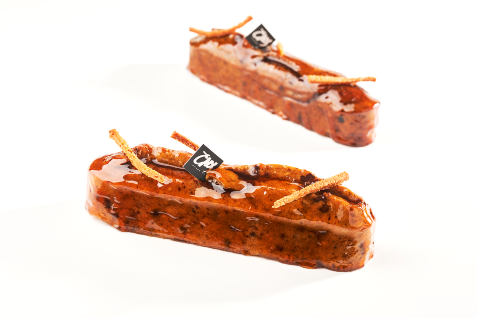 Spennellare leggermente le melanzane con olio d'oliva, arrostirle nel forno a legna, poi conservarle in un contenitore di vetro. Una volta raffreddate, togliere la buccia ed estrarre la polpa. Frullare polpa, zucchero e sciroppo d'acero, aggiungendo gradualmente le uova. Una volta ottenuto un composto omogeneo, aggiungere farina e lievito. Sciogliere il burro e aggiungerlo caldo. Unire infine le nocciole a pezzi e il cioccolato. Versare negli stampi fino a 3/4 dell'altezza e cuocere in forno moderato. Una volta cotti e ancora caldi, immergere i cake nello sciroppo d'acero. Congelare.
