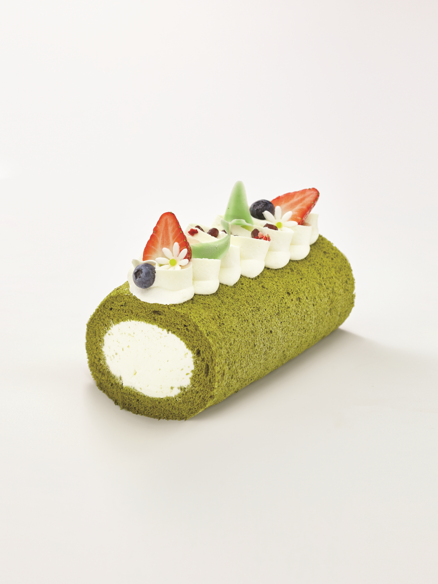 Tagliare la base al tè matcha in 4 parti. Rimuovere la parte superiore. Spalmare sulla base 270 g di crema al mascarpone e 80 g di crema pasticcera al tè matcha. Arrotolare il roll. Decorare dressando spuntoni di crema al mascarpone (70 g) e guarnire con fragole, mirtilli, cioccolato e fiorellini di zucchero.