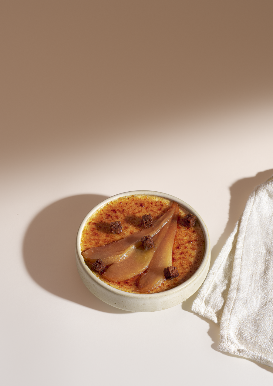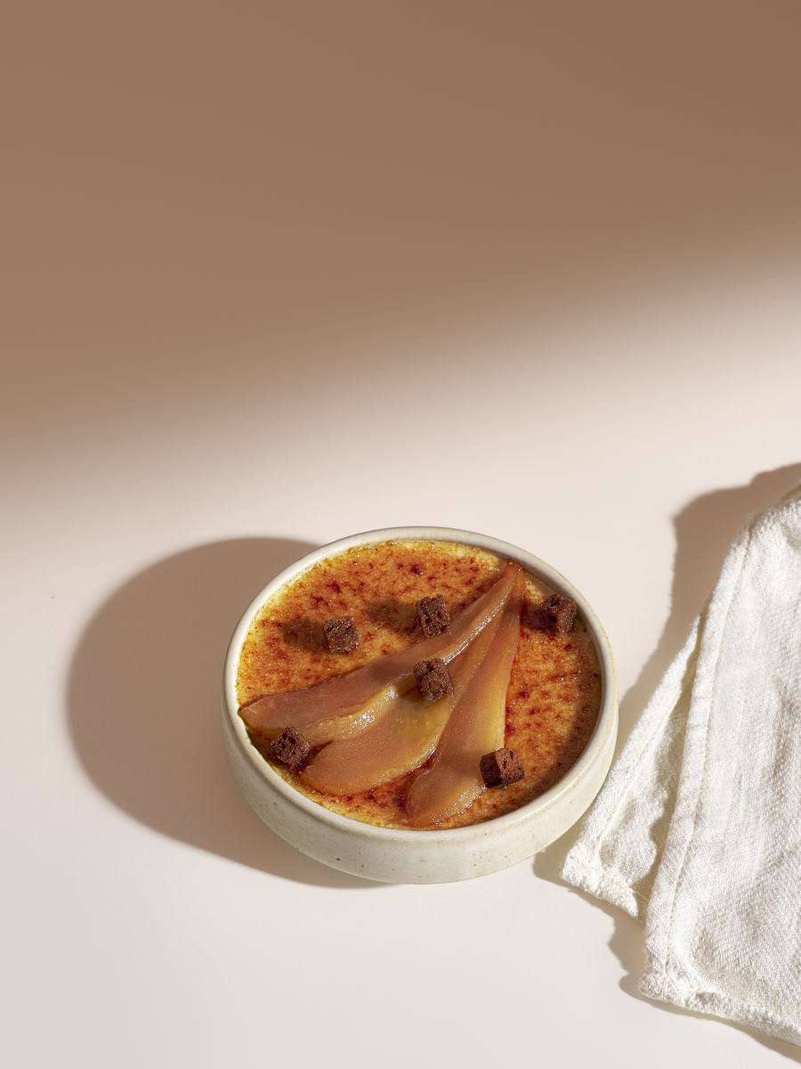 Tagliare le pere a cubetti, cuocerle con zucchero e vaniglia, poi posizionarle sul fondo delle terrine. Cuocere anche i quarti di pera per la decorazione e mettere da parte. Scaldare la Crème brûlée fino ad ebollizione. Togliere dal fuoco, aggiungere le 5 spezie e mescolare bene. Versare sui cubetti di pera. Lasciare raffreddare per 20 minuti a temperatura ambiente e poi in frigorifero per almeno 3 ore. Al momento del servizio, caramellare la superficie e aggiungere cubetti di pan di zenzero e quarti di pera.
