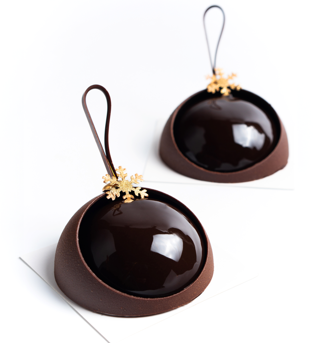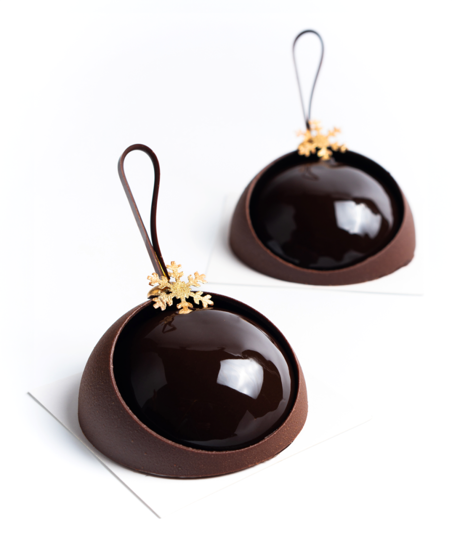 Coppare le basi di streusel e di pan di spagna nelle forme desiderate e abbattere. Dressare la chantilly negli stampi a semisfera con l'uvetta macerata e abbattere. Versare la ganache e adagiare il pan di spagna con lo streusel sopra. Abbattere nuovamente. Quando l'inserto è congelato, preparare la mousse e versare in stampi a semisfera più grandi. Inserire l'inserto, adagiare la base di streusel sopra e abbattere. Glassare con la glassa al cacao.