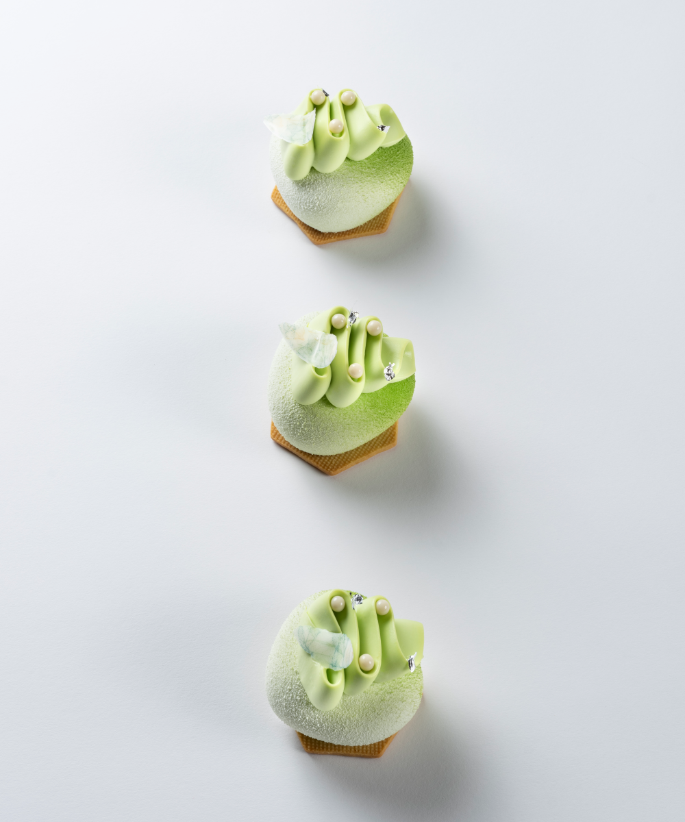 Versare nello stampo desiderato il cremoso al cocco sormontato dal pan di spagna al pandan. Inserire l'inserto nella chantilly al pandan e chiudere con la base croccante al cocco. Abbattere e sformare, spruzzare con glassa a specchio e posizionare su basi di sablé alla mandorla. Decorare con namelaka di pandan.