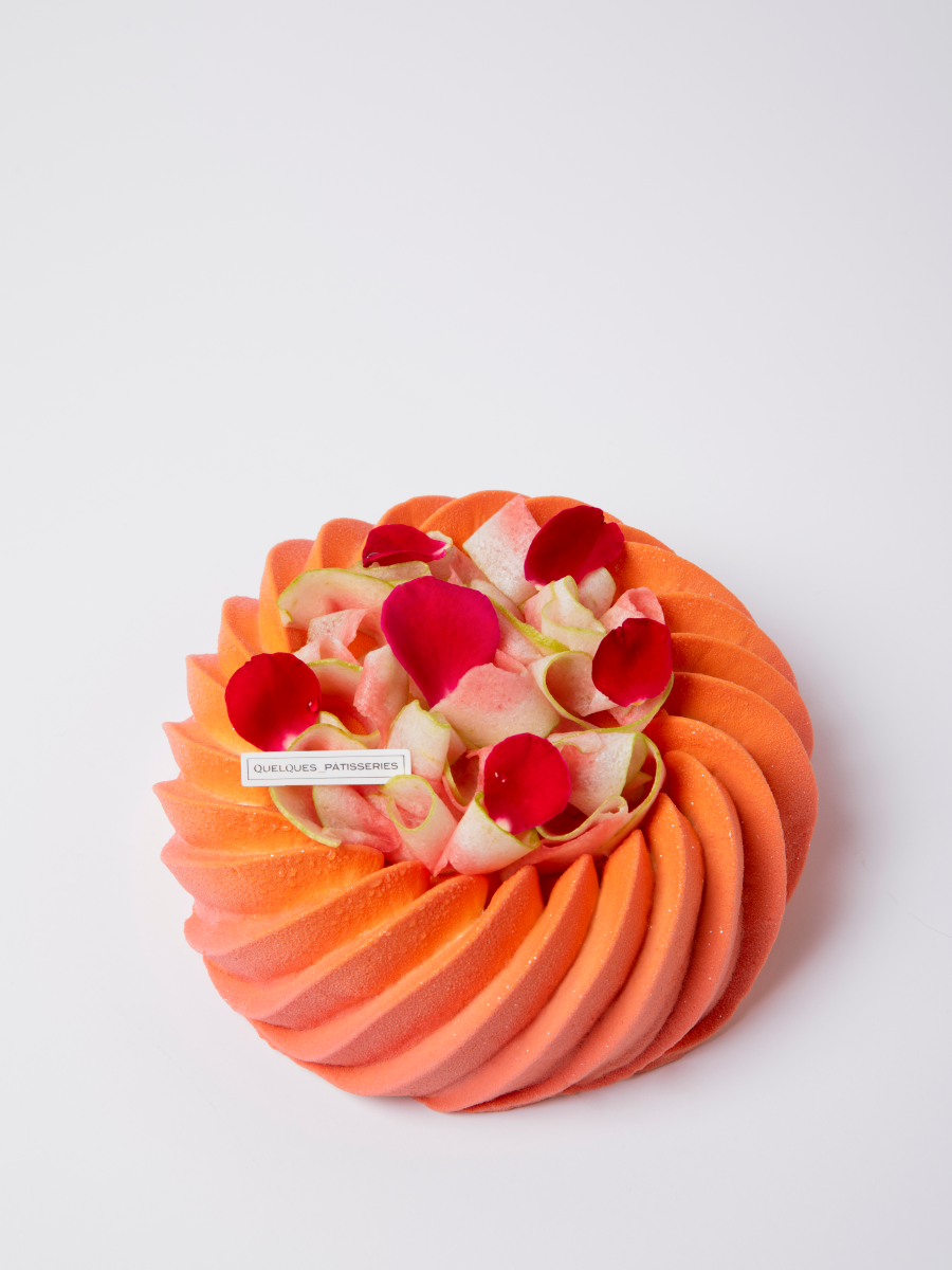 Scaldare 140 g di panna, versare sul cioccolato bianco fino a completo scioglimento, poi mixare. Mixare separatamente le puree e l'acqua di rose con lo zucchero, scaldare a 70 °C e versare sulla preparazione gelatinosa. Quando la gelatina sarà sciolta, mixare bene. Infine, mixare i due composti, poi aggiungere il resto della panna fredda, il mascarpone, la pasta di mandorla, le zest di pompelmo e i petali di rosa. Mixare nuovamente con frullatore ad immersione. Dopodiché, filtrare il composto in un contenitore, coprire con pellicola a contatto e conservare tutta la notte in frigorifero prima dell'uso.