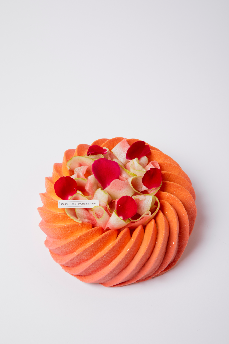 Mixare latte, tuorli e zucchero, poi aggiungere la purea di pompelmo e l'acqua di rose per preparare una crema pasticcera. Aggiungere la gelatina reidratata, poi raffreddare a 60 °C e frullare con il burro per formare un'emulsione.