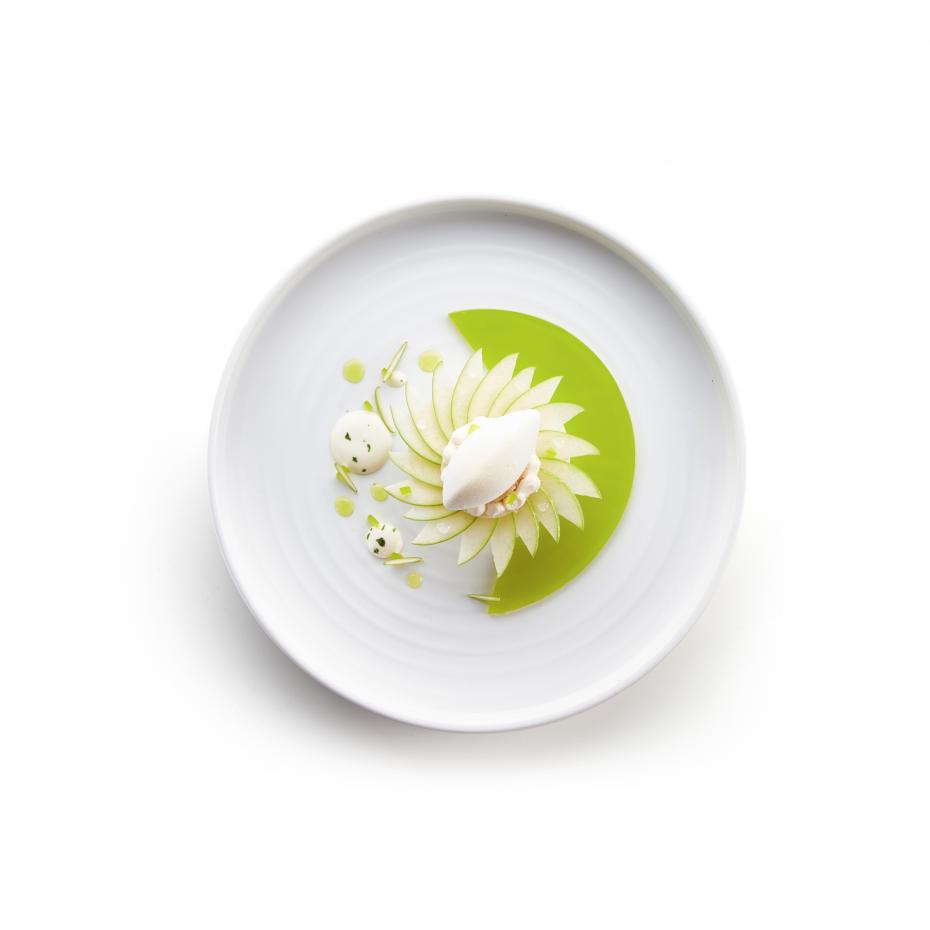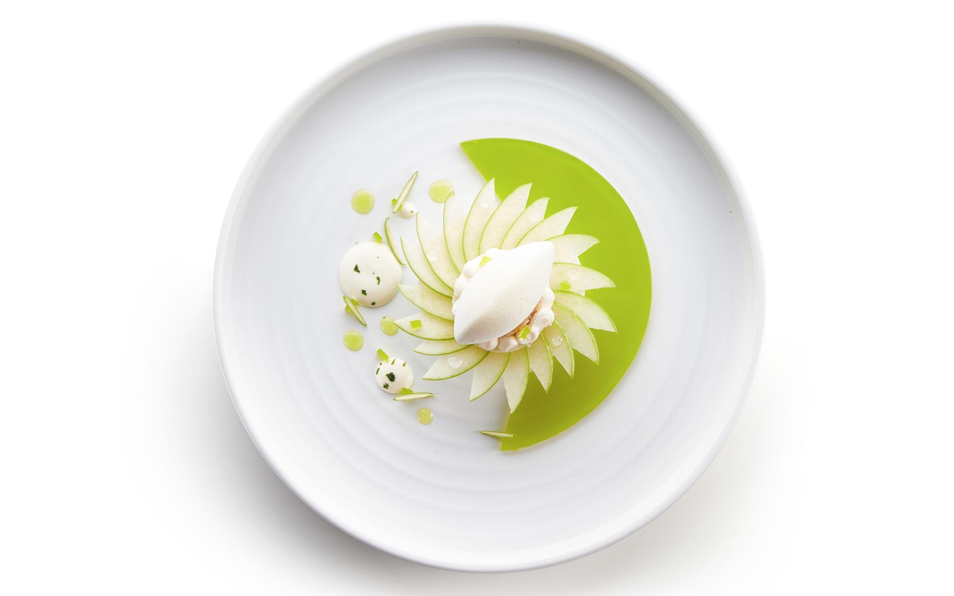 Per prima cosa, posizionare la gelatina verde e le fette di mela – tagliate con mandolina giapponese – disposte in cerchio, quindi posizionare al centro un disco di meringa e sopra un disco di pasta sablée. Quindi dressare una piccola quantità di ganache al cream cheese. Posizionare sopra un disco di pan di spagna e sulla circonferenza fare piccoli spuntoni di mousse, quindi posizionare la quenelle di sorbetto. Infine, decorare con mele verdi a fette, ganache al cioccolato bianco e cream cheese, pezzettini di mela, basilico tritato e cubettini di gelatina.
