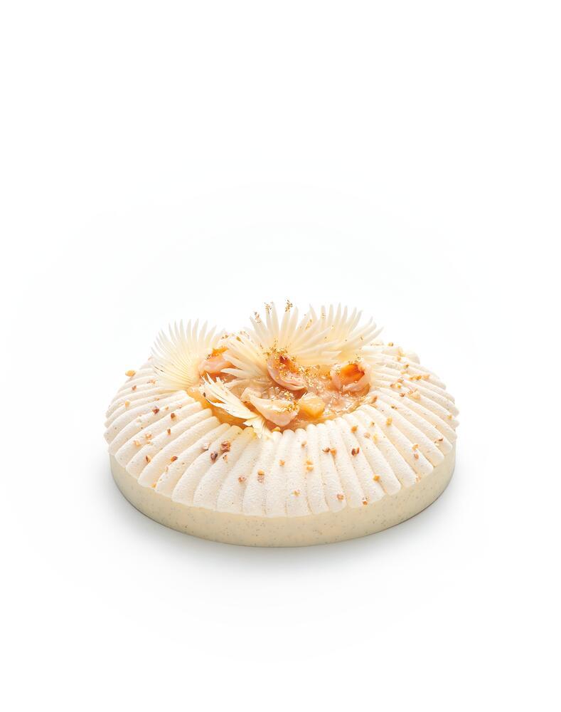 Line Ø18-cm x 2-cm high tart rings with 130 g of reconstituted almond shortbread. Chill. Pipe in 40 g of light vanilla cream, spread out and top with a Ø18 cm disc of almond genoise. Cover with 60 g of vanilla cream and smooth the surface. Freeze. On the surface, pipe out a ring composed of 110 g of vanilla cream using a plain 18-mm tip. Fill the centre of the ring with 130 g of peach-litchi compote. Top with a 10-cm disc of almond genoise. Spread the vanilla cream over the exterior to create a sloped top and smooth the surface. Chill. Pipe out the vanilla cream on the slope using a large 6-cm ribbon tip. Sprinkle with chopped almonds and decorative snow sugar. Place a 2-cm high band of white chocolate around the base of the entremets. Fill the centre with 50 g of peach-litchi compote. Decorate with canned litchis and white chocolate fans.